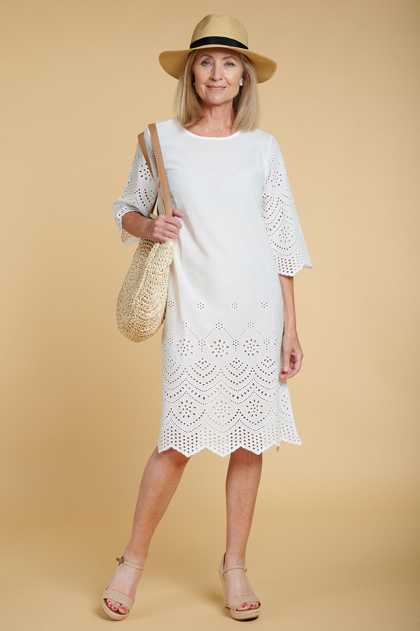 - Style: A sophisticated broderie style summer dress with a unique hem cut out detailing that adds a modern touch to a traditional design.