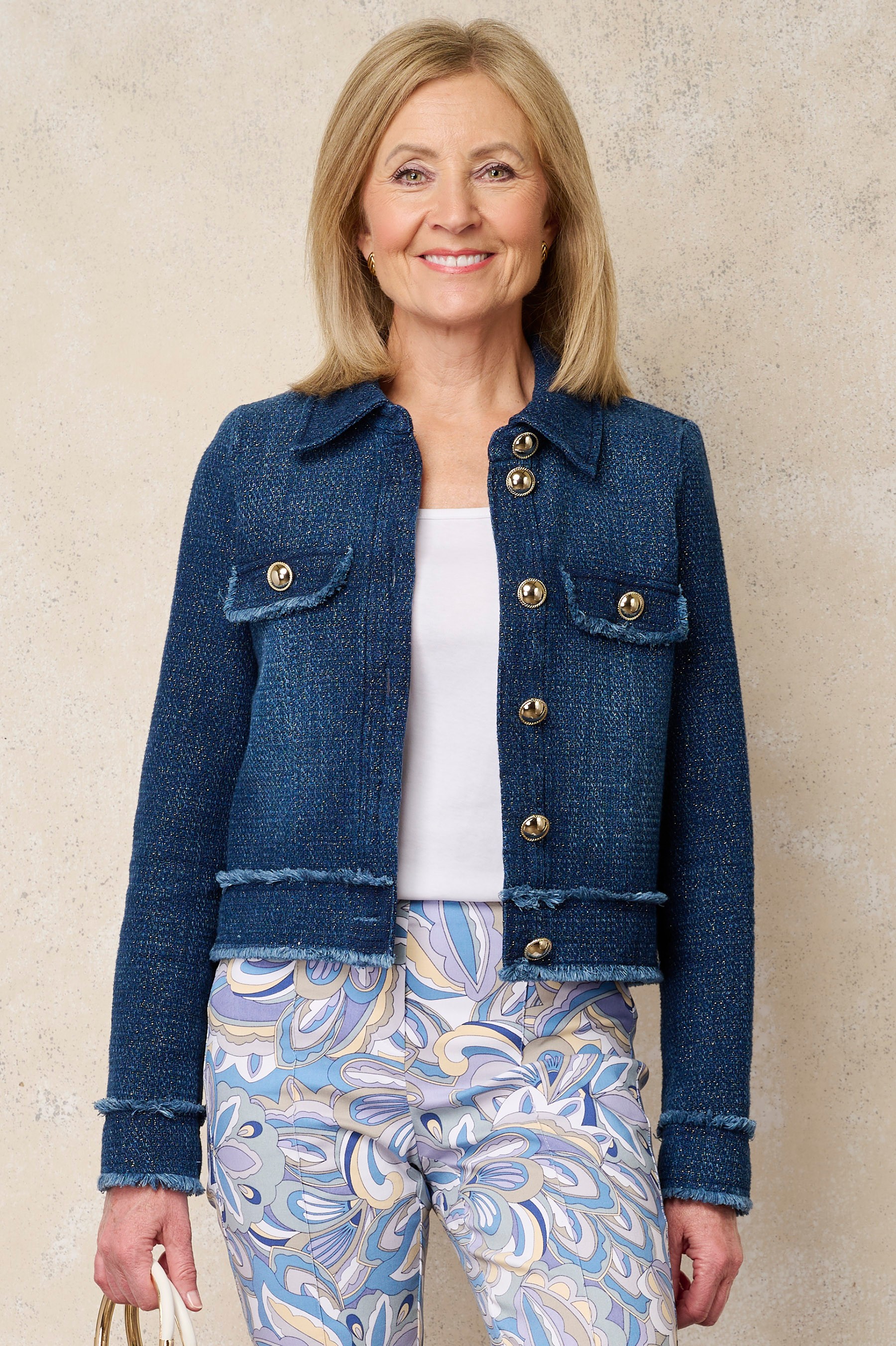 Refined texture meets contemporary elegance in the Robell Alma Denim Shimmer Bouclé Jacket. Expertly crafted from a premium cotton-rich bouclé infused with subtle metallic thread, this piece brings understated luminosity to a timeless tailored silhouette. The softly structured fabric offers depth and dimension, while delicate fringe trims add a signature couture-inspired finish.