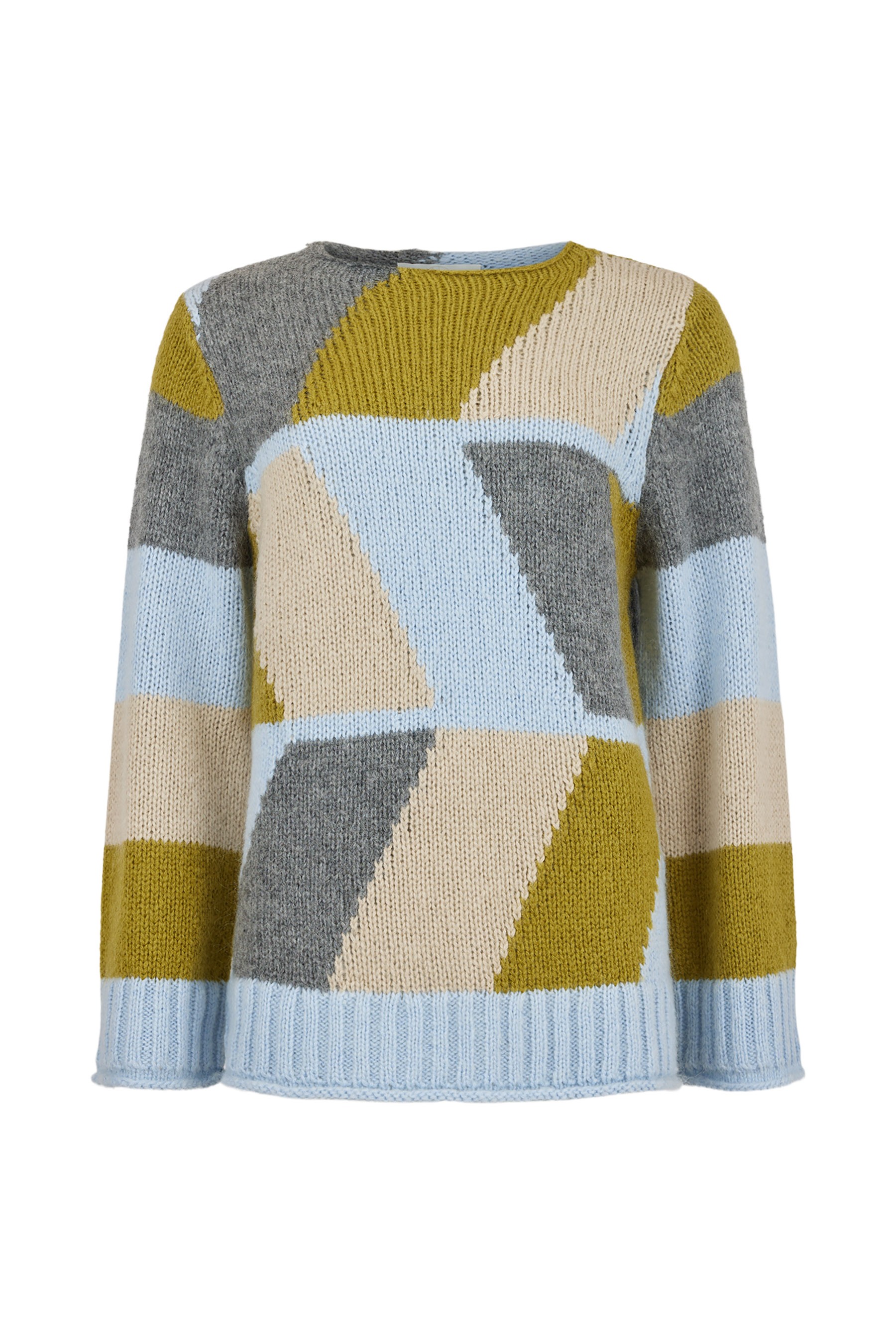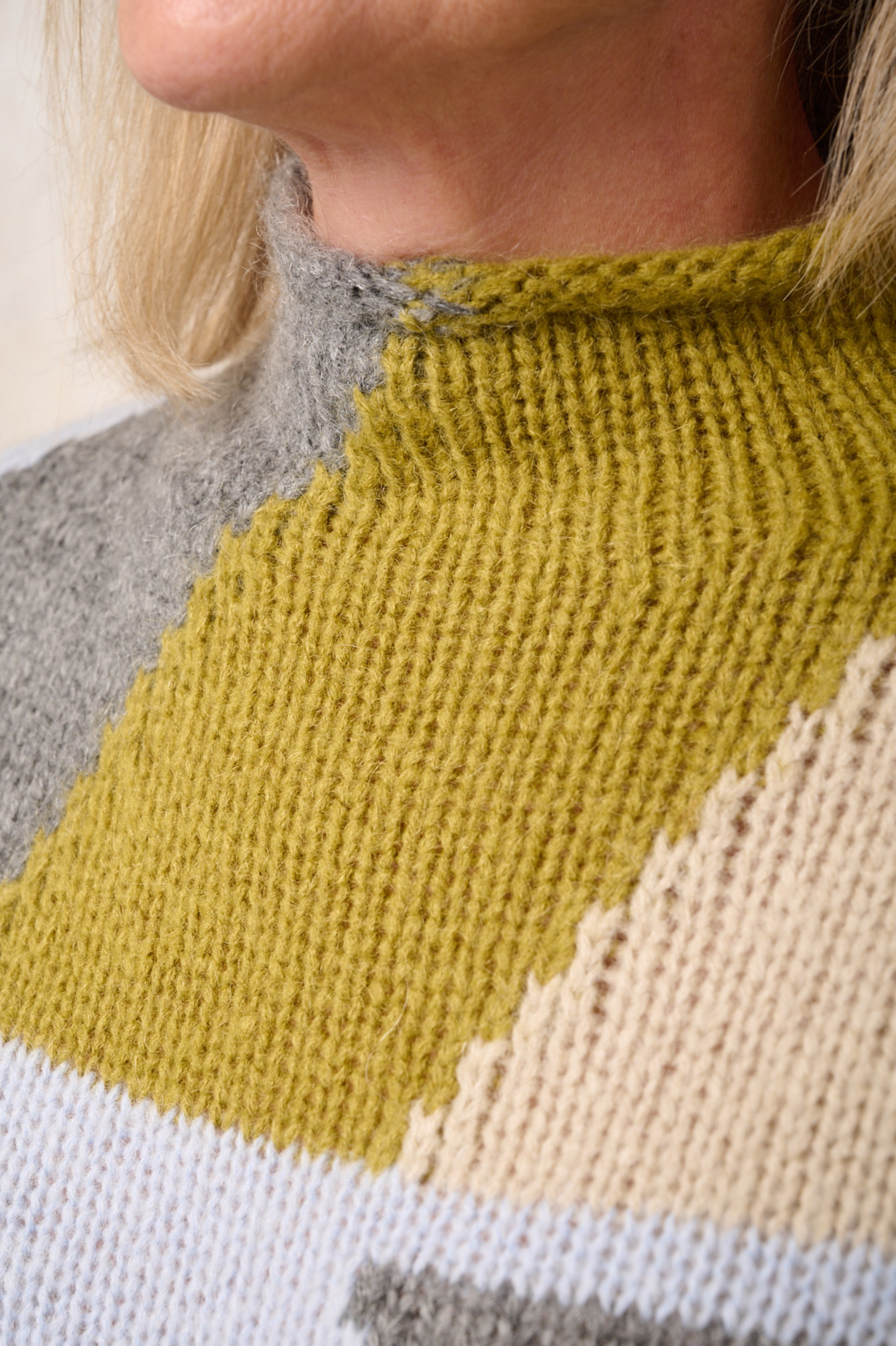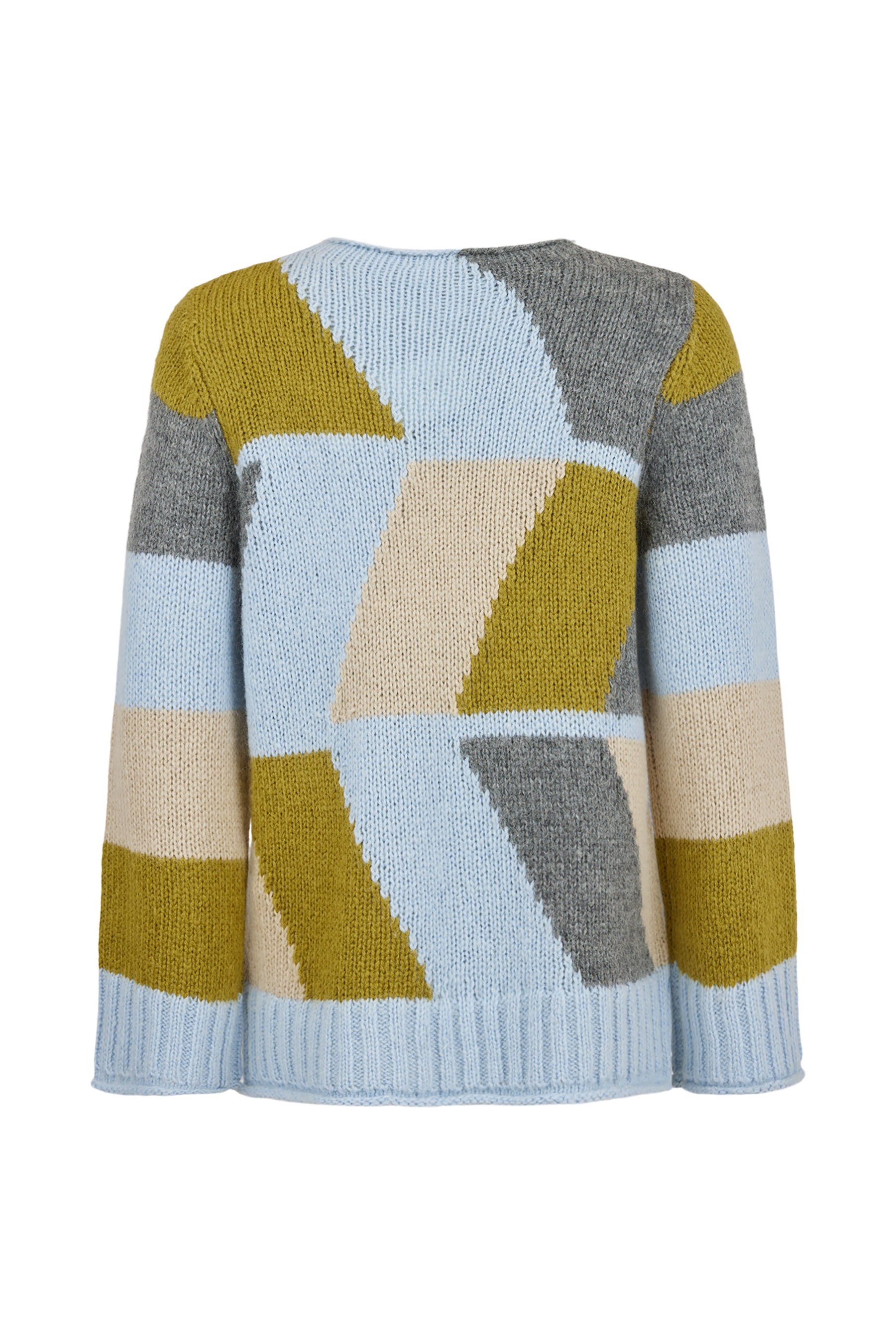 The Noen Geometric Colour Block Knit Jumper makes a vibrant statement in contemporary knitwear. Its bold geometric design blends sky blue, olive, grey, and cream into striking blocks of colour, creating an eye-catching yet versatile piece.