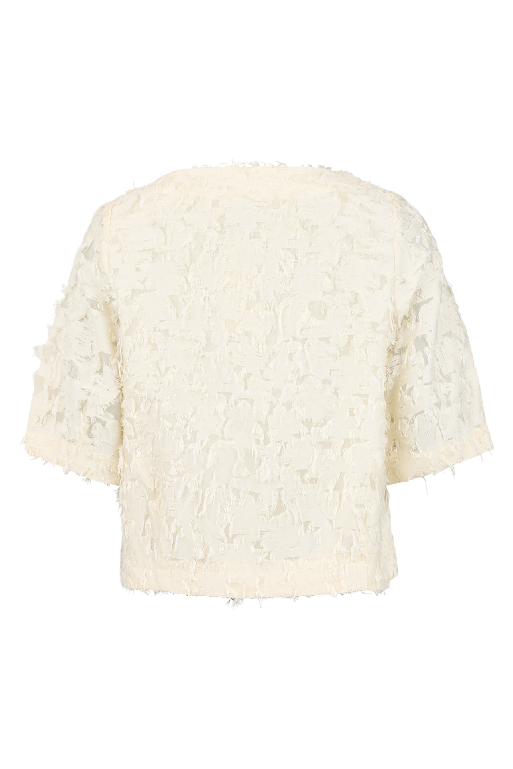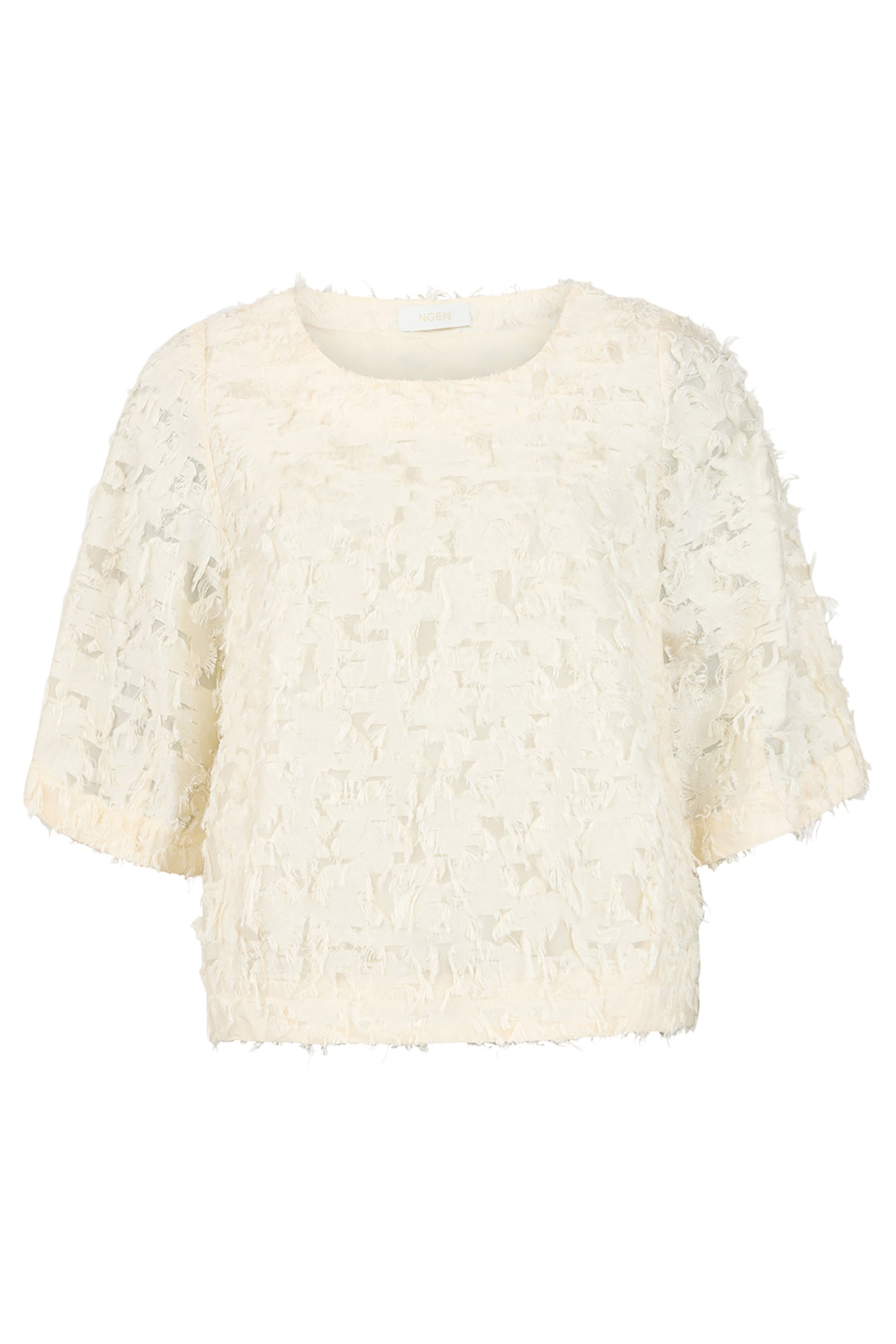 Refined yet relaxed, the Noen Textured Ruffle Top is a modern wardrobe essential with understated impact. Crafted from the same signature textured fabric as the coordinating trousers, this soft cream top features a sculptural surface that adds depth, movement, and quiet luxury to a minimalist silhouette.
