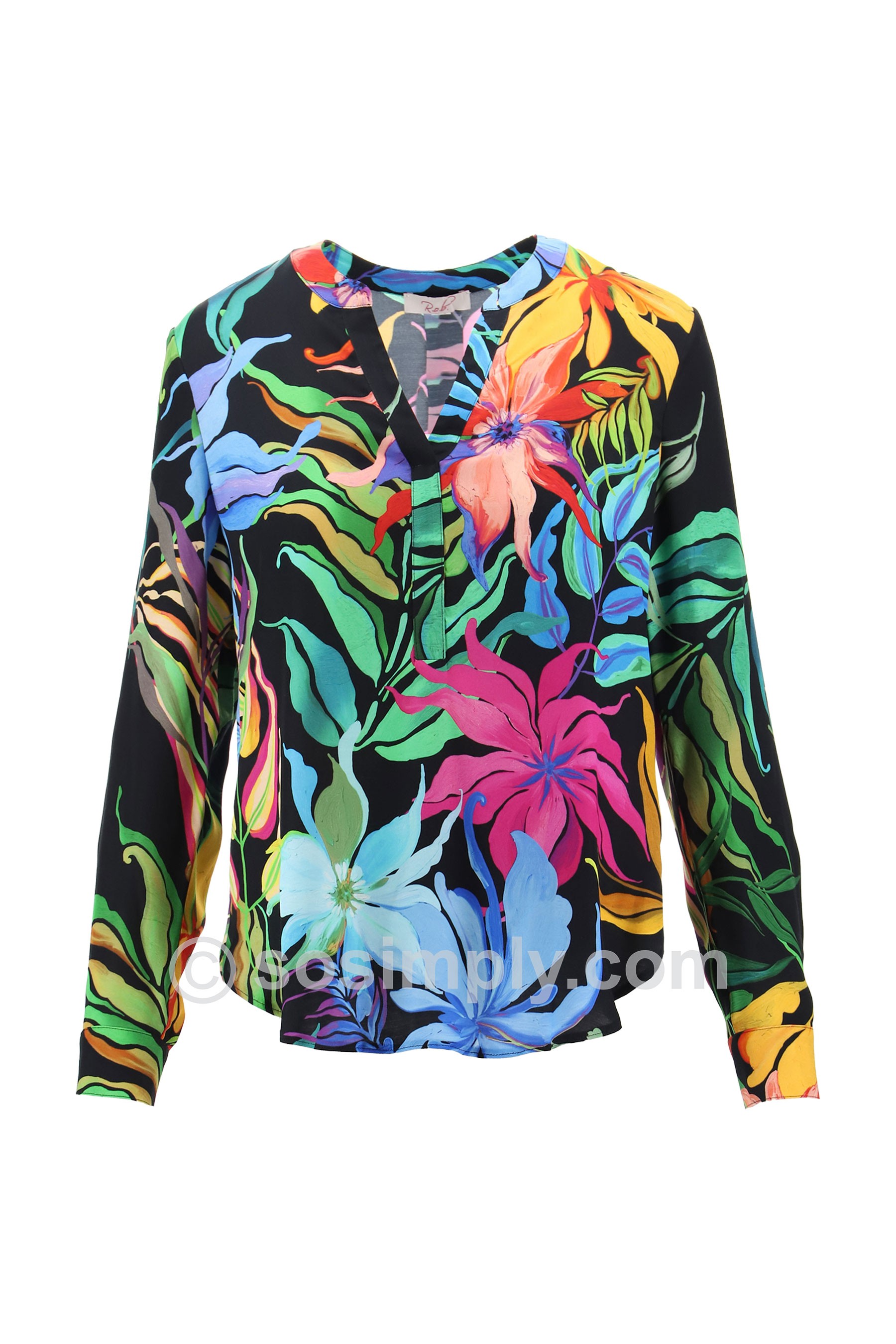 Designed in a vibrant Mediterranean-inspired floral and leaf print, this holiday-ready piece brings instant colour and glamour to your wardrobe. The flattering silhouette features a round neckline with a soft V-cut opening, full-length sleeves, and a shaped shirt hem for an easy, elegant finish. Simply pull it on and pair with shorts, cropped trousers, or wedges for an effortless day-to-night look.