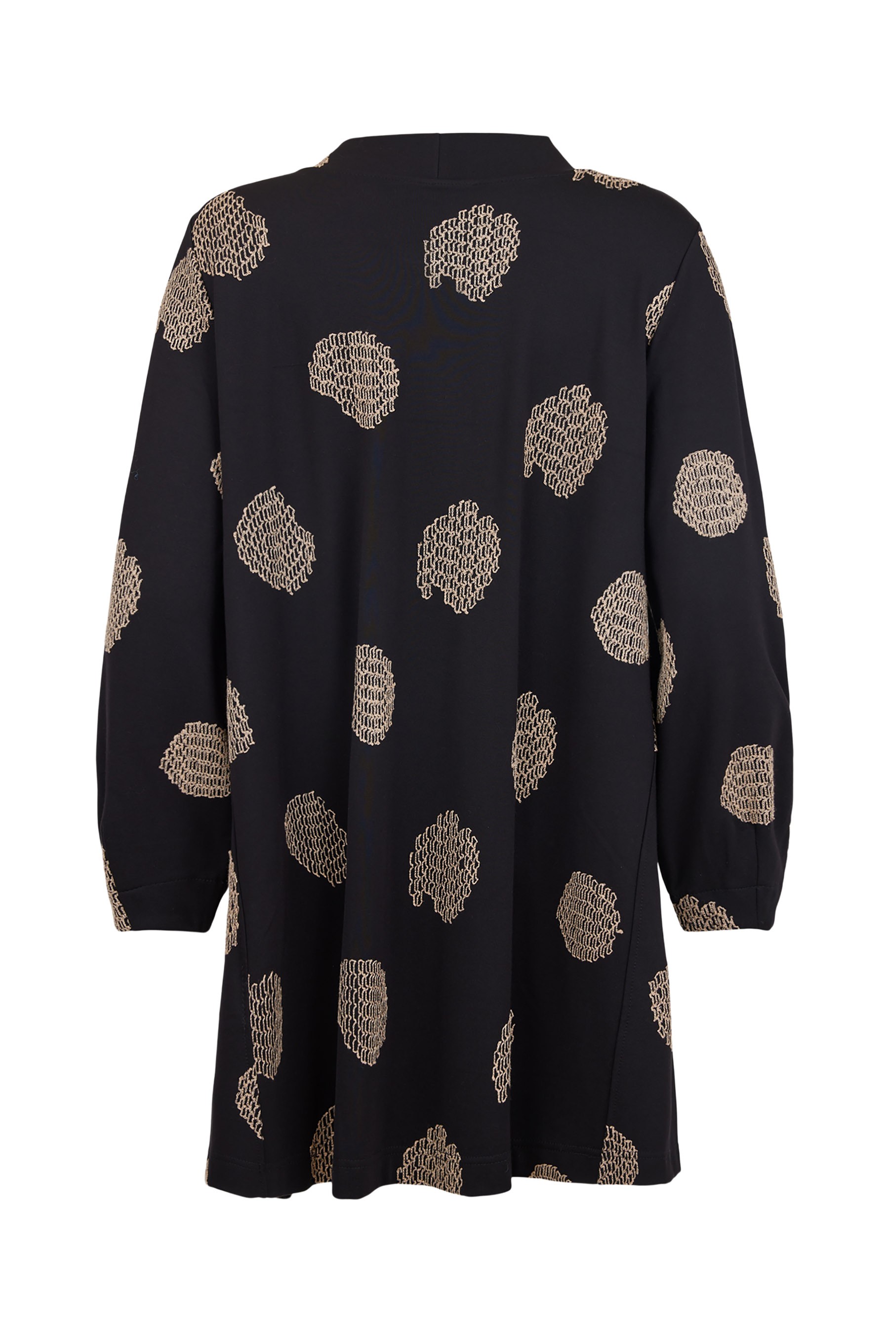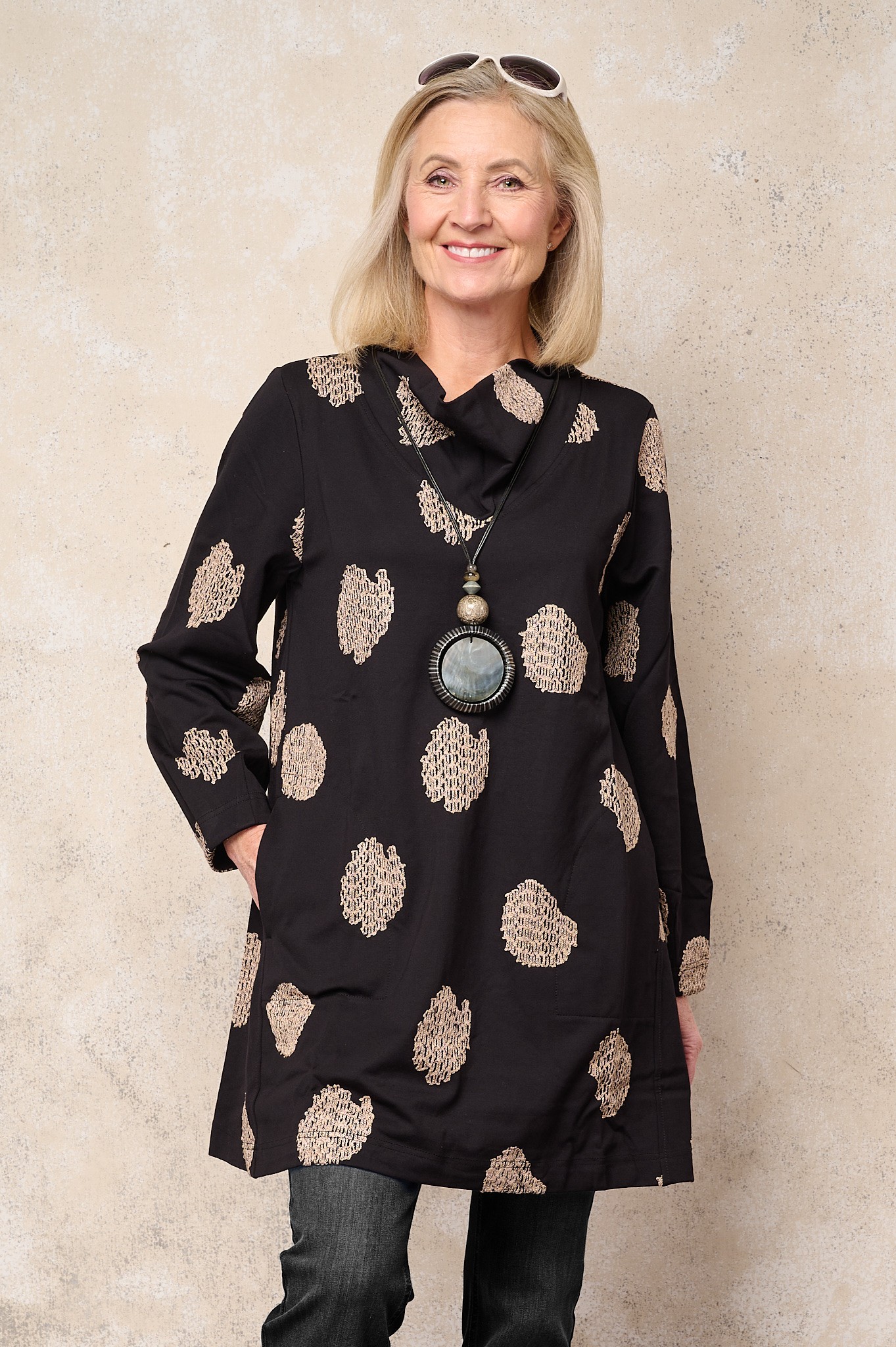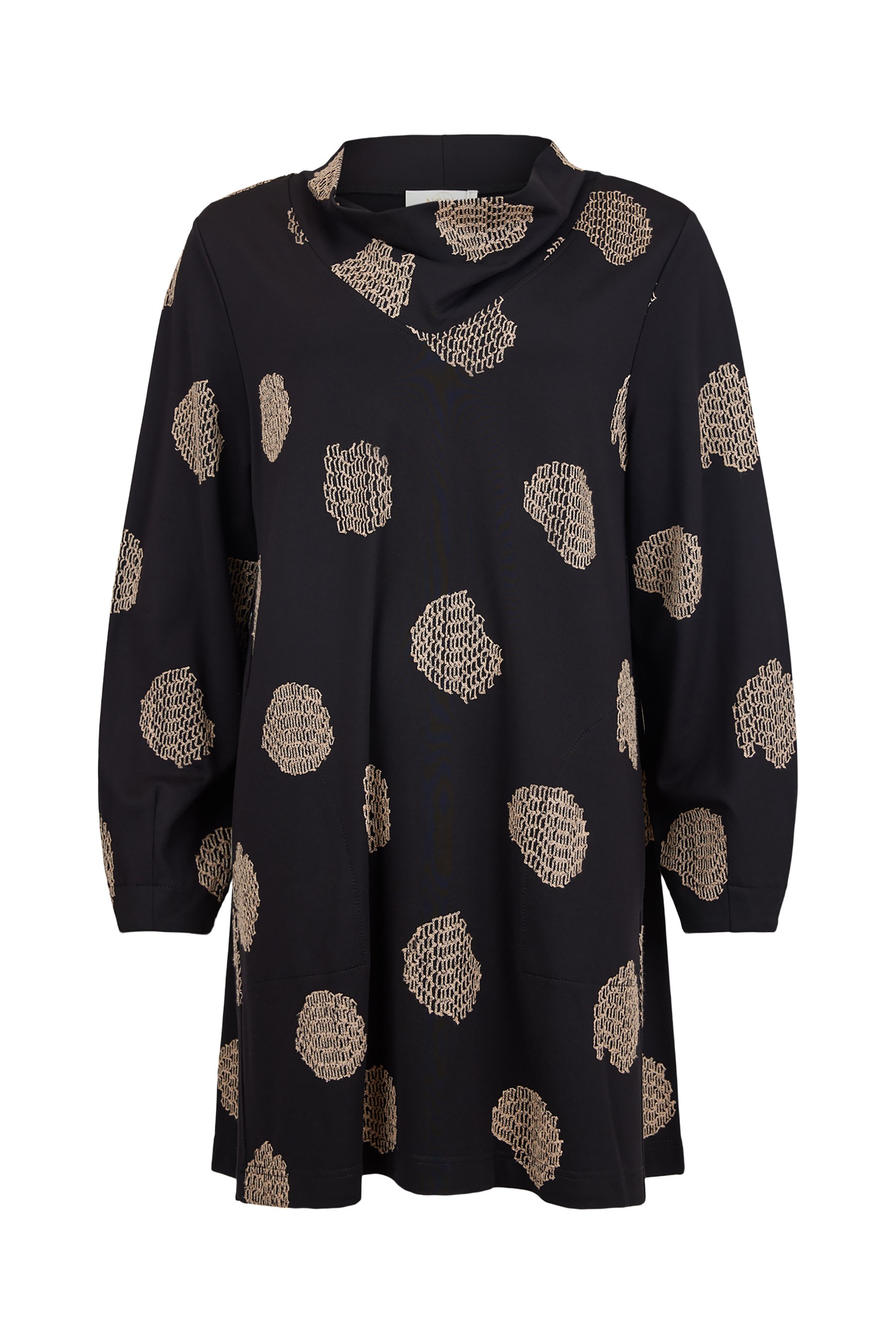 Its relaxed cowl neckline, long sleeves, and elongated tunic length make it a versatile layering piece, offering coverage and style in equal measure. The abstract sand-toned pattern set against a deep black background lends a modern, graphic touch that elevates the silhouette.