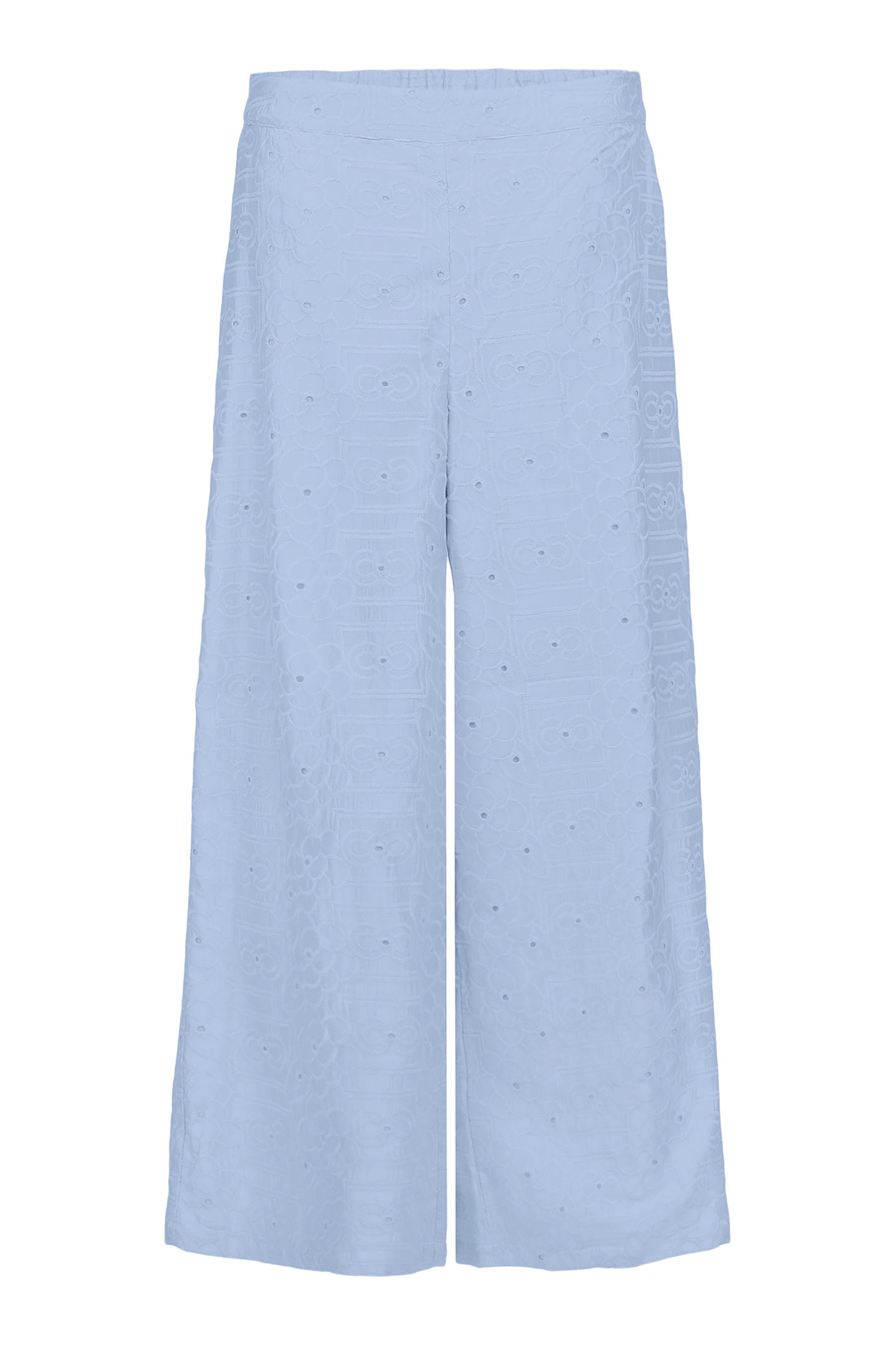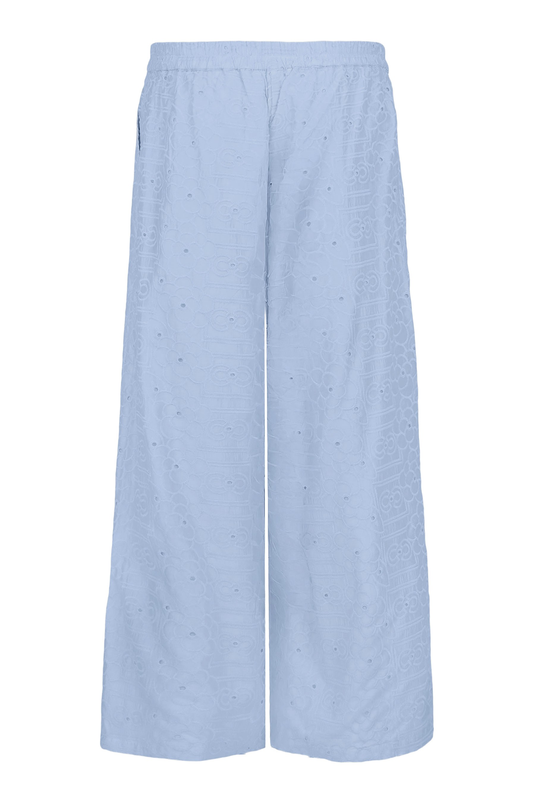 Fresh and feminine, the Noen Trinni Broderie Anglaise Trousers combine delicate texture with effortless Nordic elegance. Crafted in a soft light blue cotton blend, the fabric features intricate broderie anglaise embroidery that adds subtle detail while maintaining a light and breathable feel. The relaxed wide-leg silhouette creates a flattering drape and comfortable movement, making these trousers perfect for warm-weather dressing. Designed to pair beautifully with the matching shirt, they offer an easy coordinated look that feels both modern and timeless.