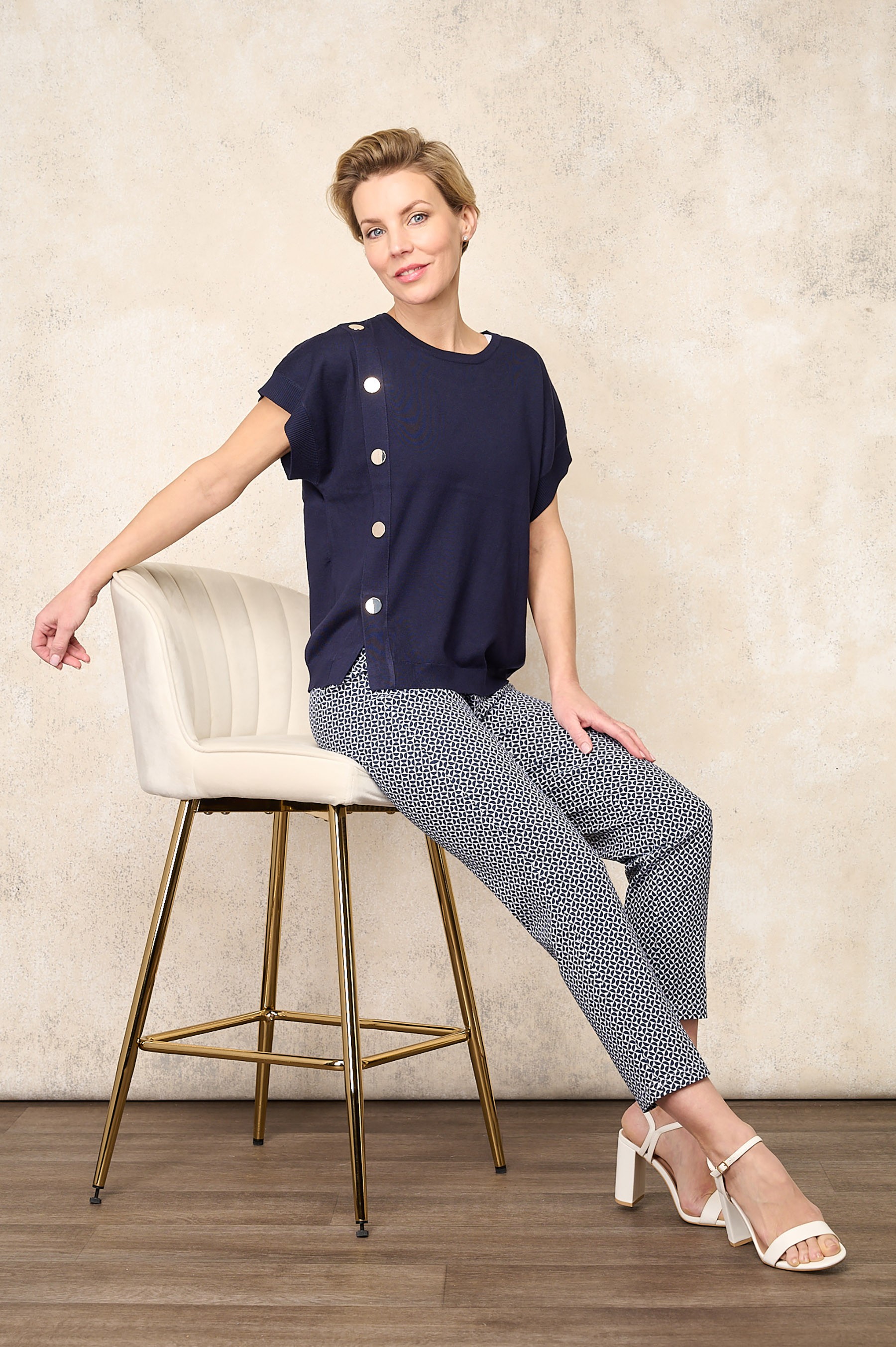 The subtle Calissa geometric print adds a contemporary yet timeless touch, elevating the look without overpowering it. Finished with a smooth pull-on waistband and tailored faux zip detailing, this style delivers a clean, streamlined fit that transitions seamlessly from daytime wear to evening occasions.