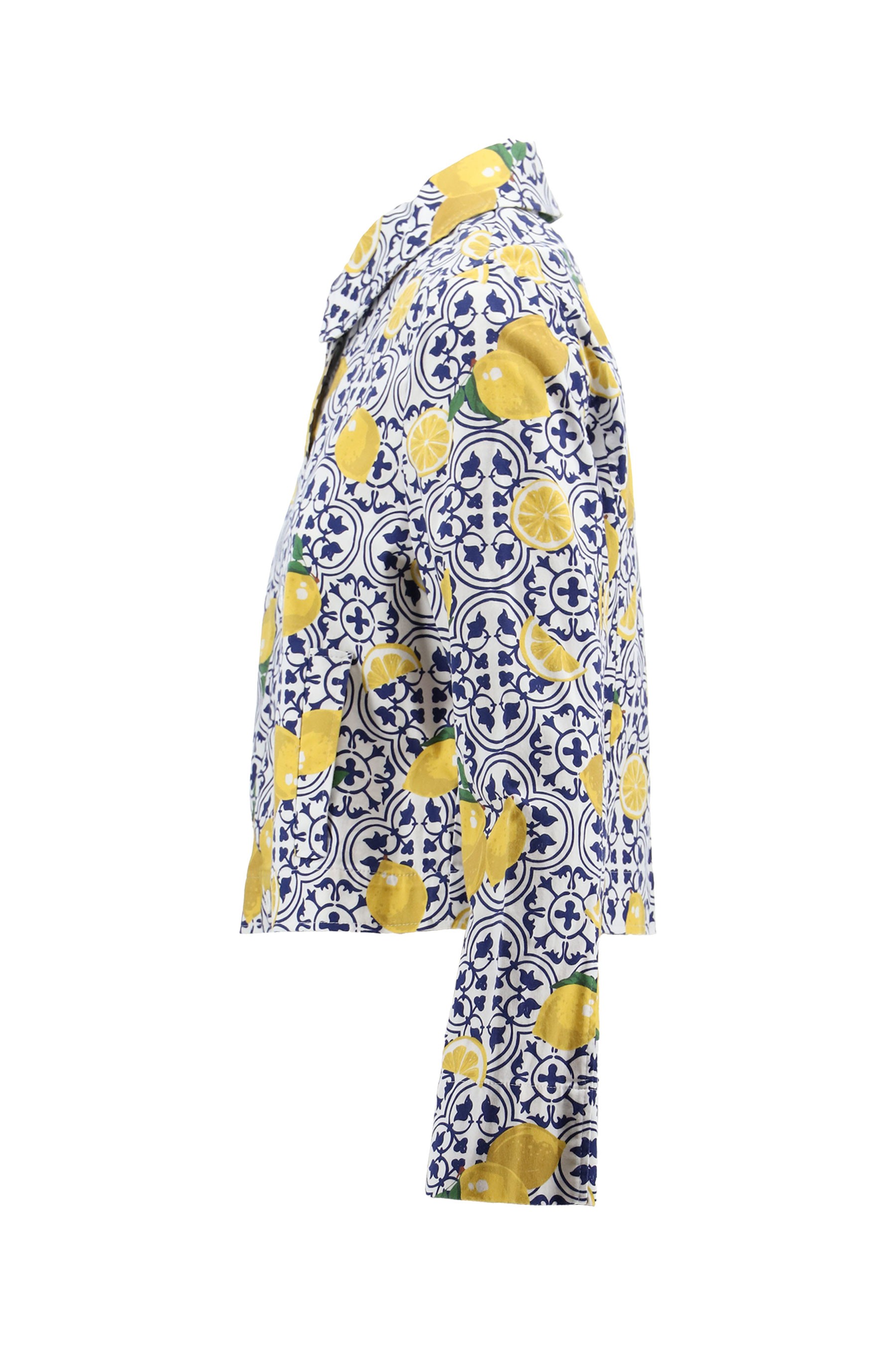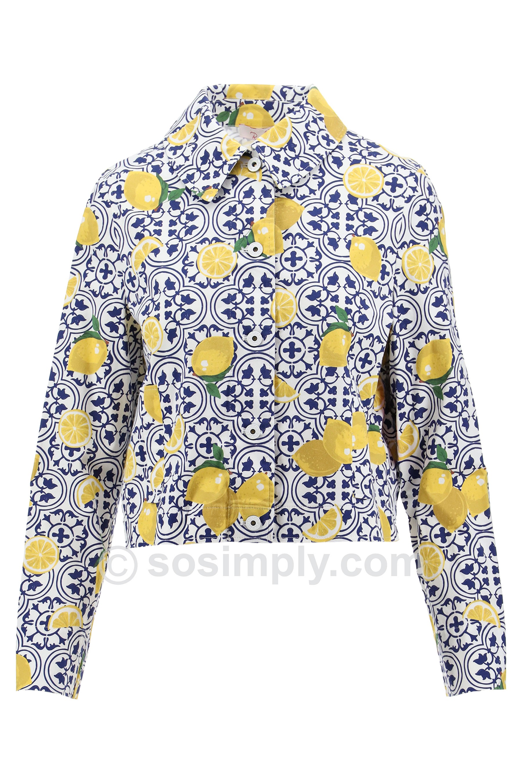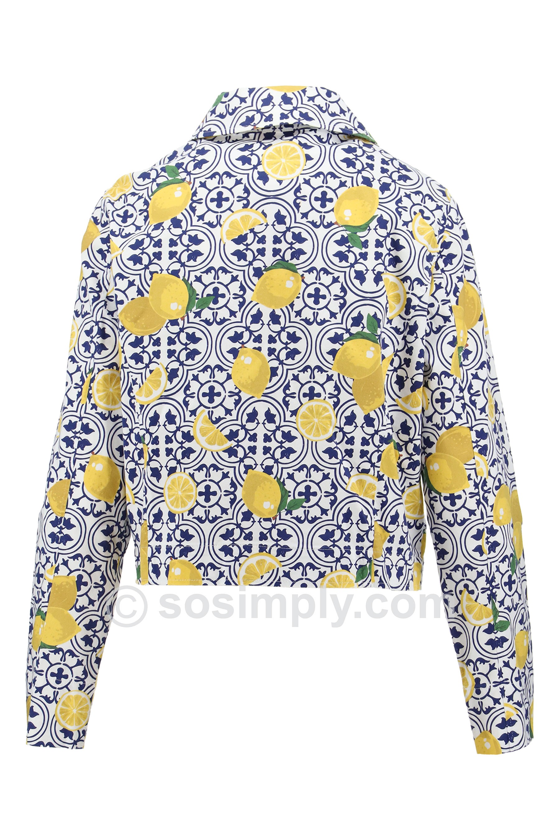Infused with Mediterranean charm, the Ela Sicilian Jacket is a vibrant expression of refined summer elegance. Inspired by the sun-drenched beauty of the Italian coast, this distinctive piece features a striking lemon motif set against an intricate cobalt tile print — evoking the artistry of traditional Sicilian ceramics.