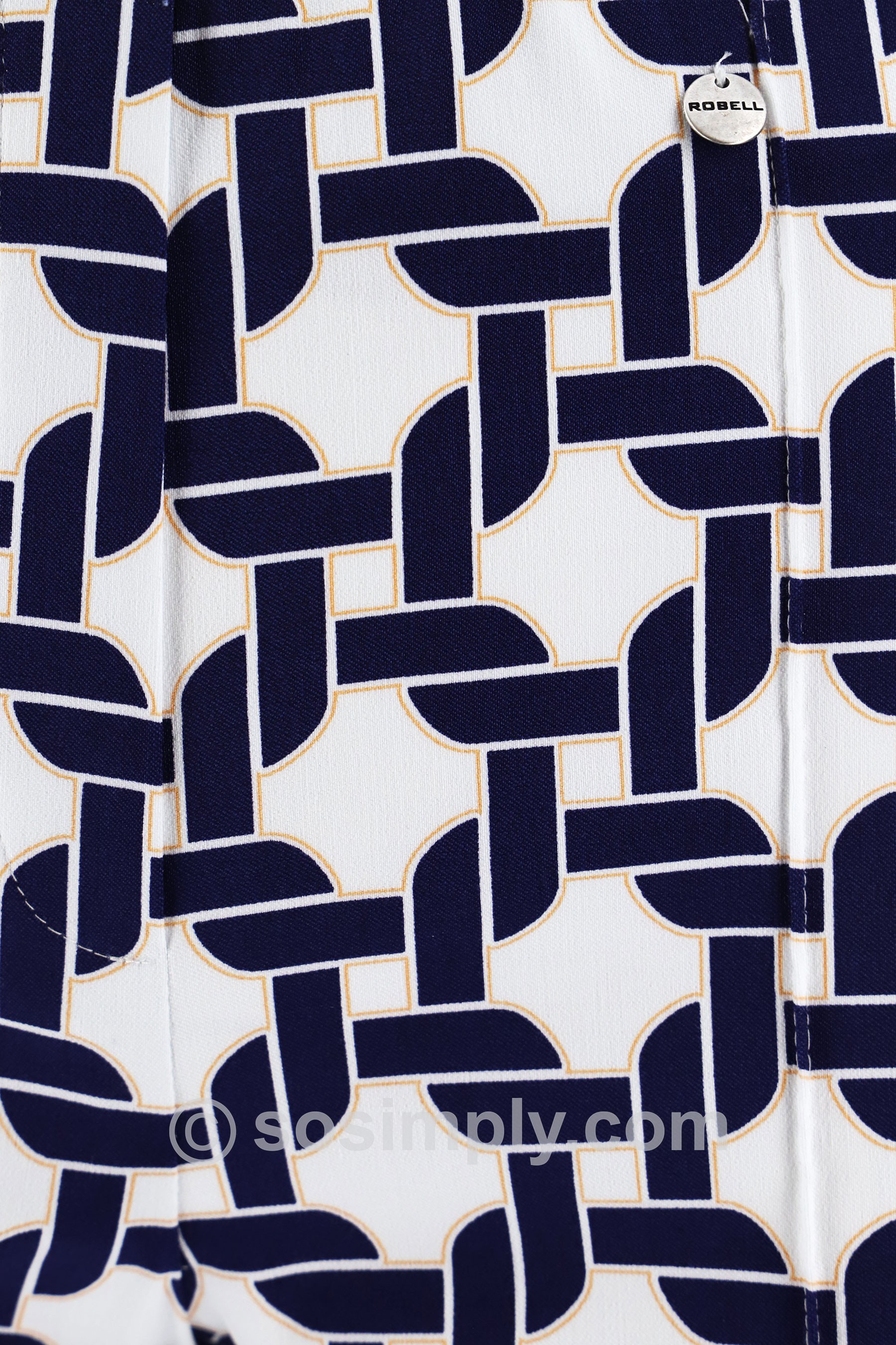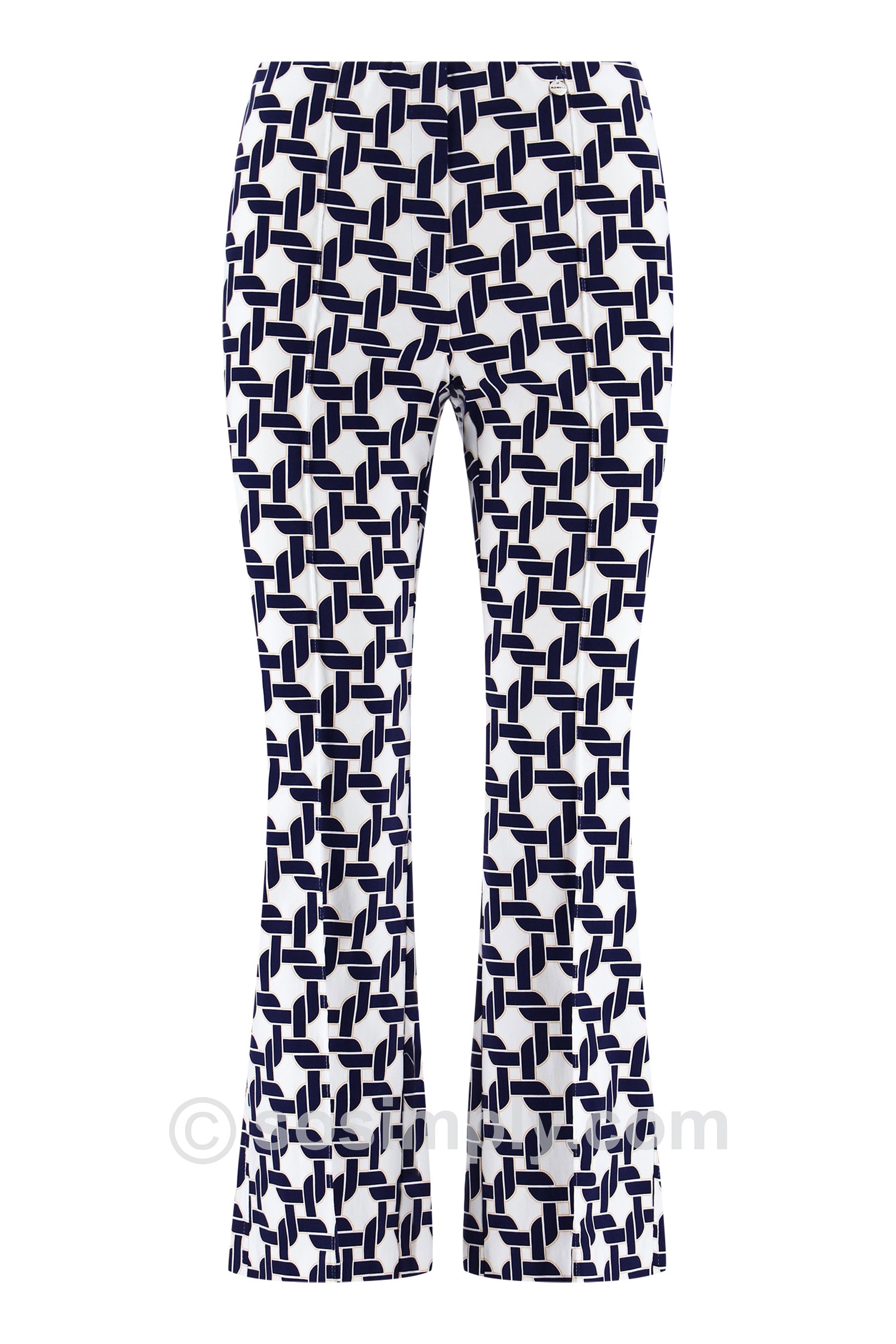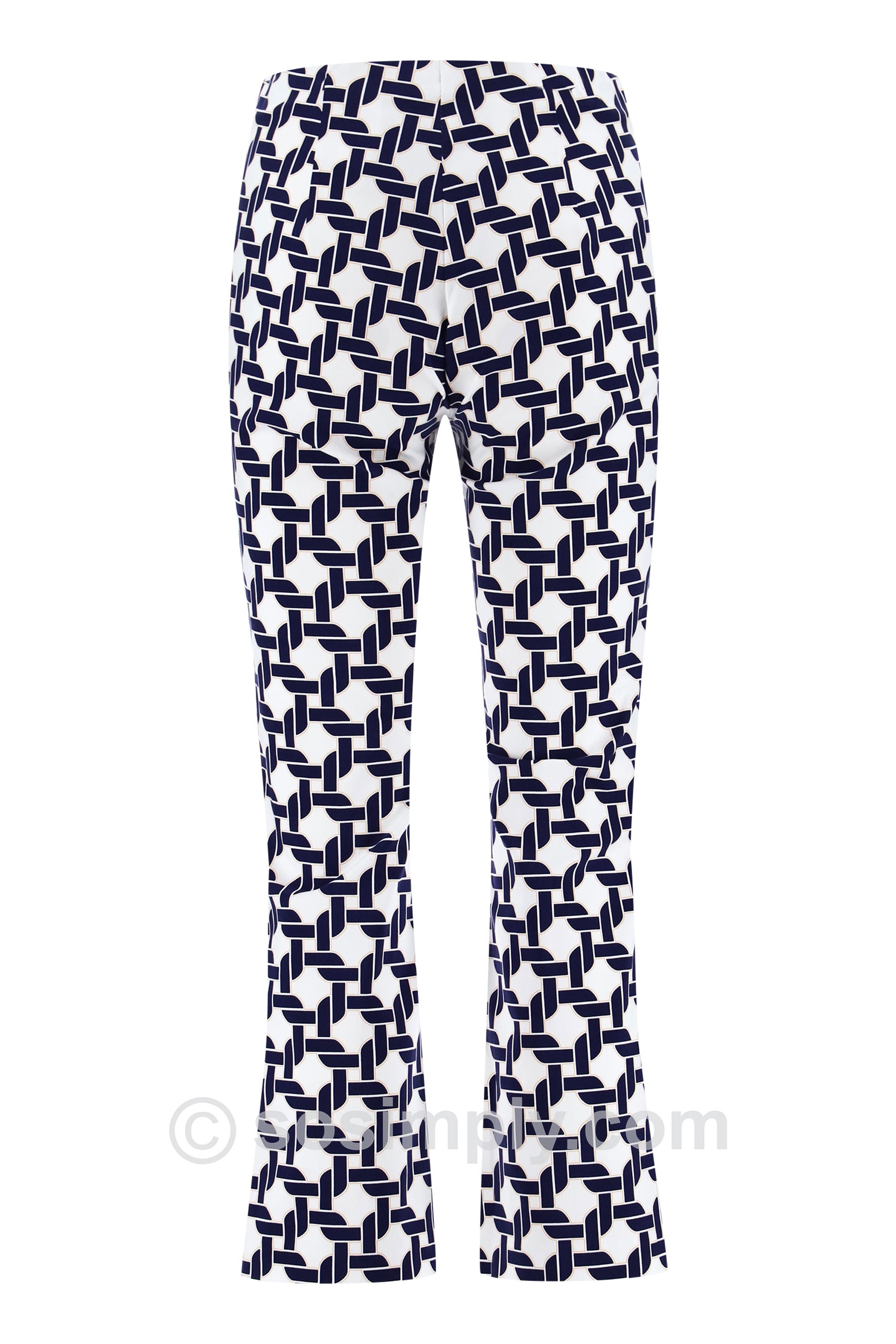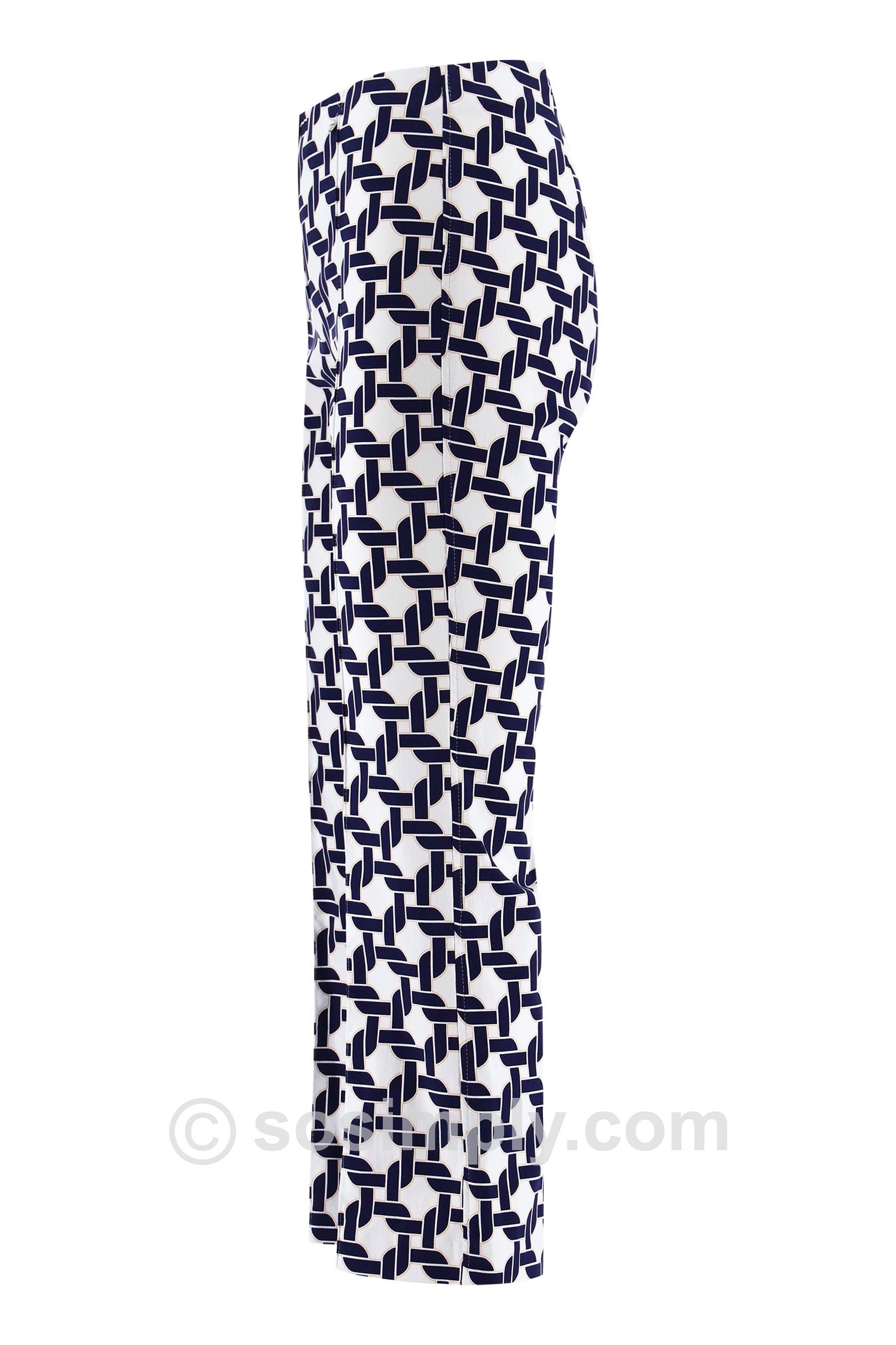 Elevate your everyday wardrobe with the Joella 09 Mosaic Link Kick Flare Ankle Grazers—a contemporary take on geometric design that blends clean structure with effortless style. Featuring an interlocking navy-on-white pattern, this striking print delivers a crisp, modern look with timeless appeal.