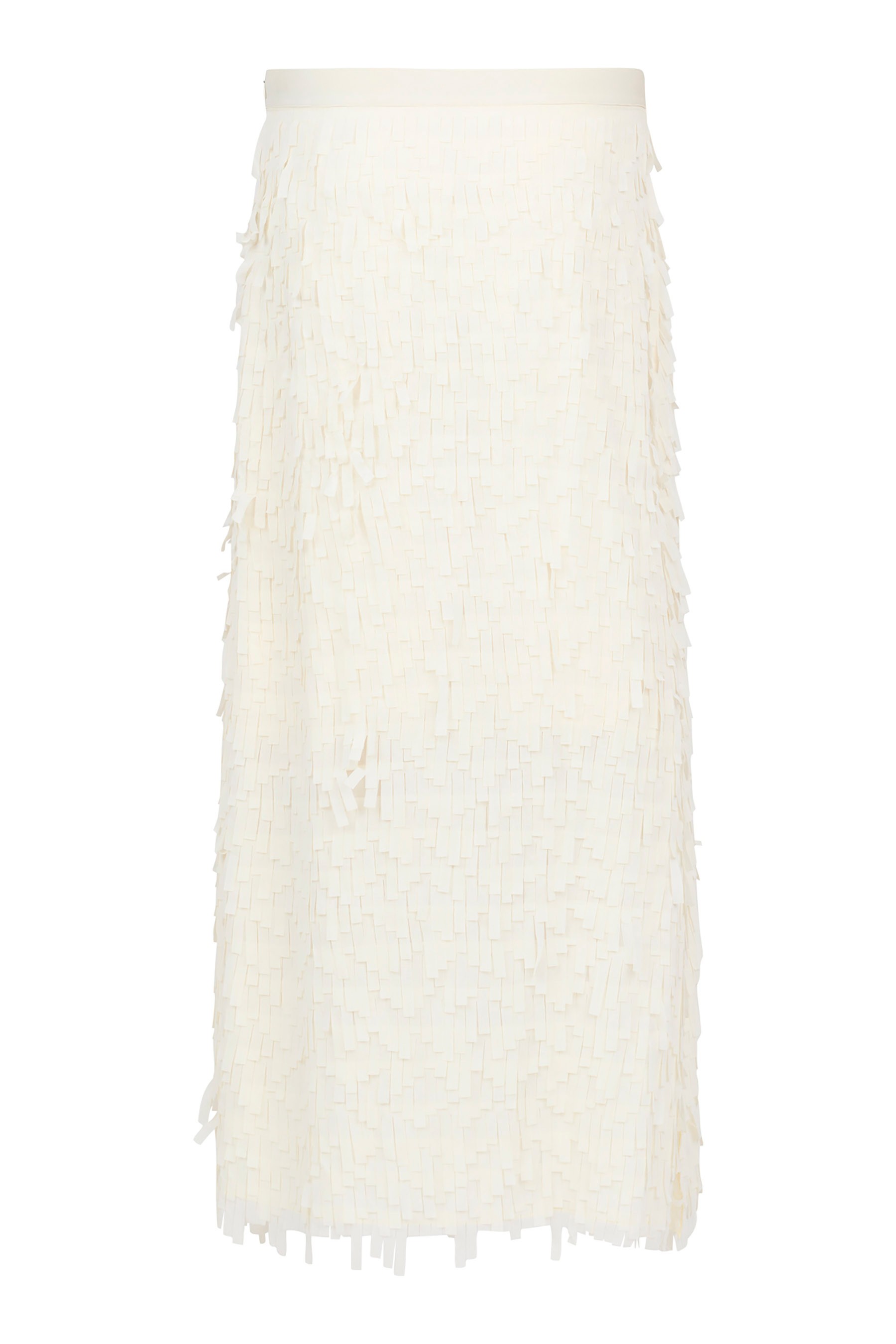The straight cut creates a flattering, elongated line, while the elasticated waistband ensures all-day comfort and ease of wear. The sculptural ruffle texture adds tactile interest and gentle fluidity with every step, making it ideal for both elevated daytime looks and refined evening styling.