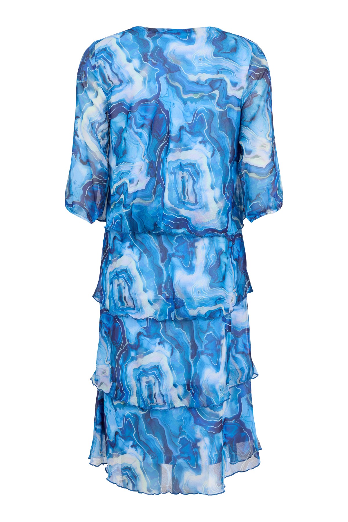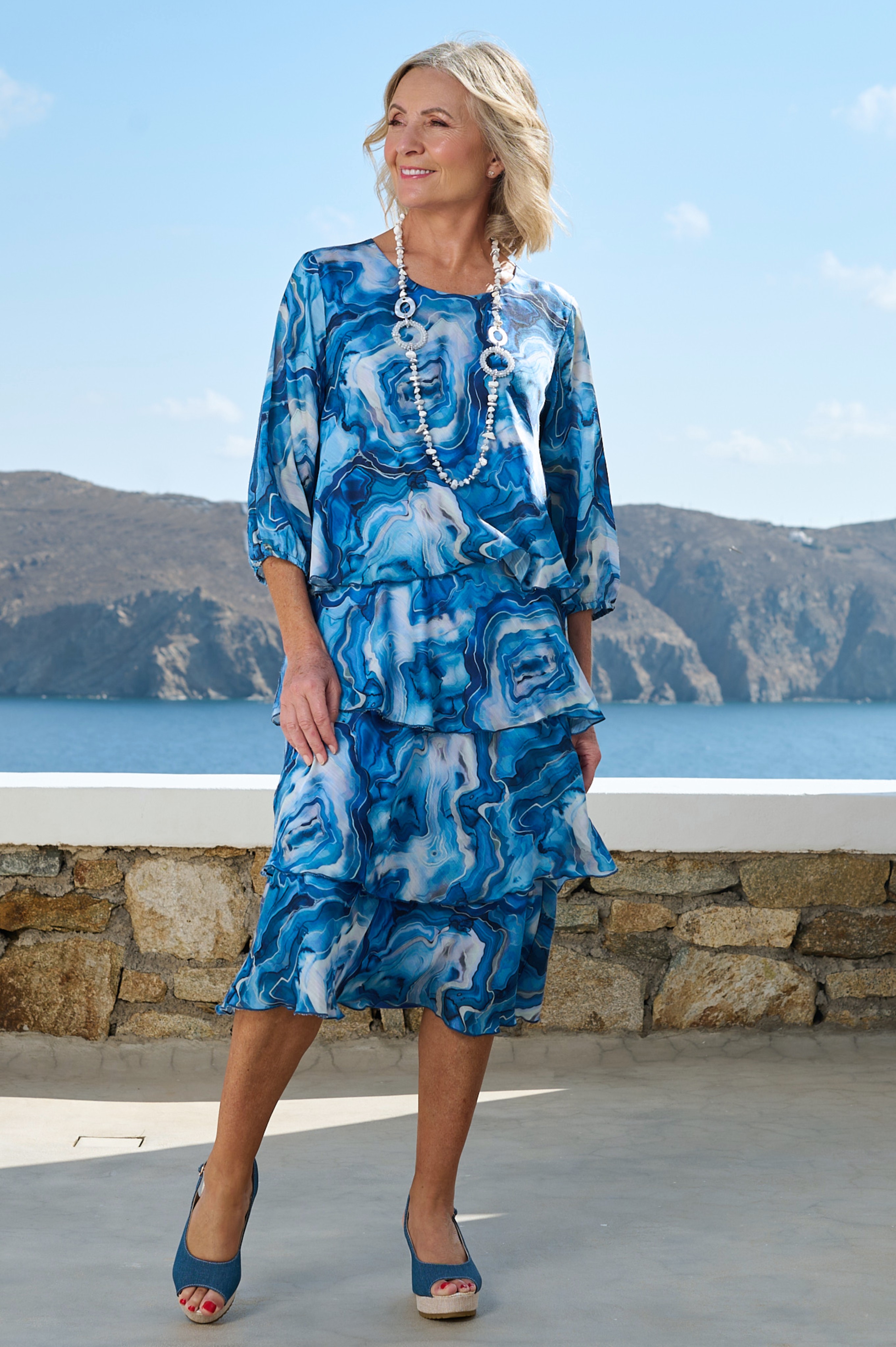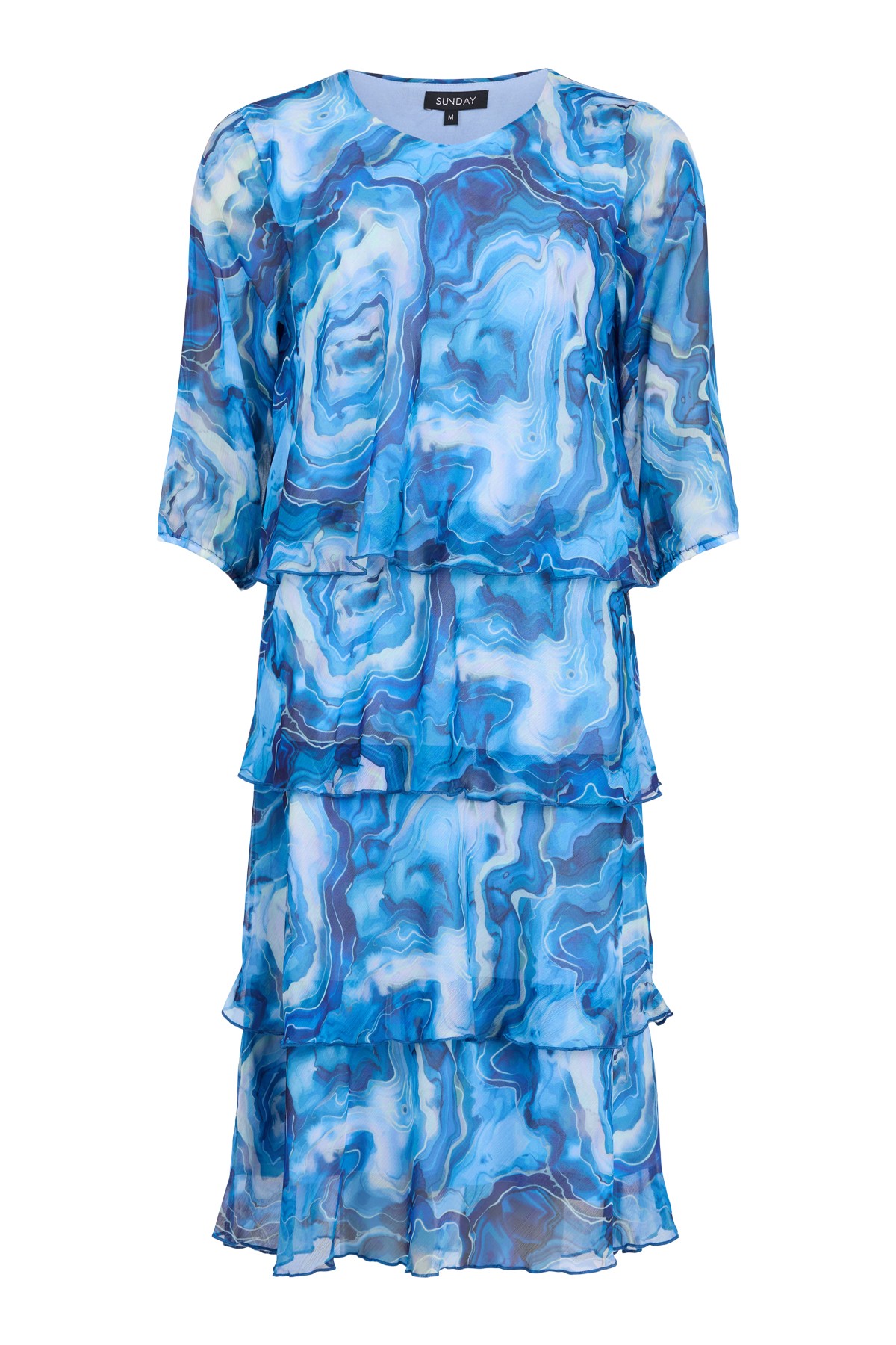Step into effortless elegance with the Aqua Illusion Tier Dress by Sunday – a beautifully fluid design inspired by the movement of water and the depth of ocean tones. Featuring a captivating marble-effect print in layered shades of blue, this dress offers a refined yet contemporary look perfect for special occasions.