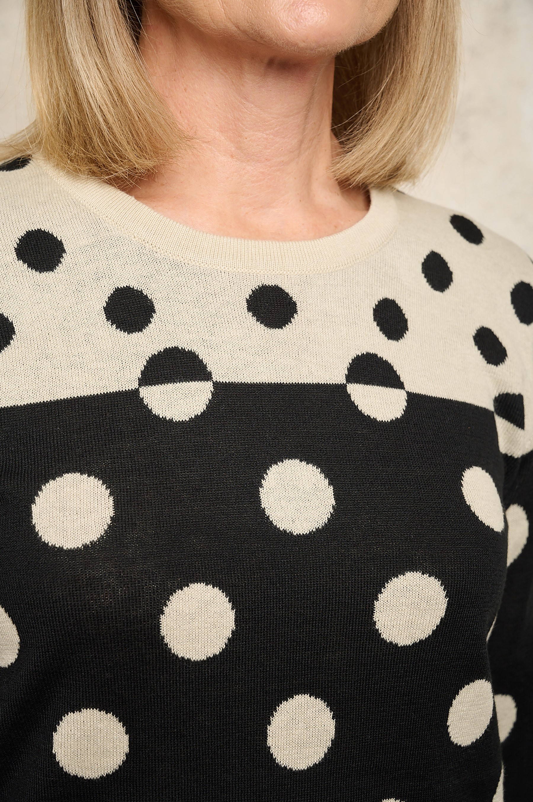 The contrasting yoke detail and all-over dot pattern create a flattering silhouette that feels both modern and classic. Whether styled with tailored trousers, denim, or a flowing skirt, this versatile jumper transitions seamlessly from casual daytime wear to relaxed evenings.