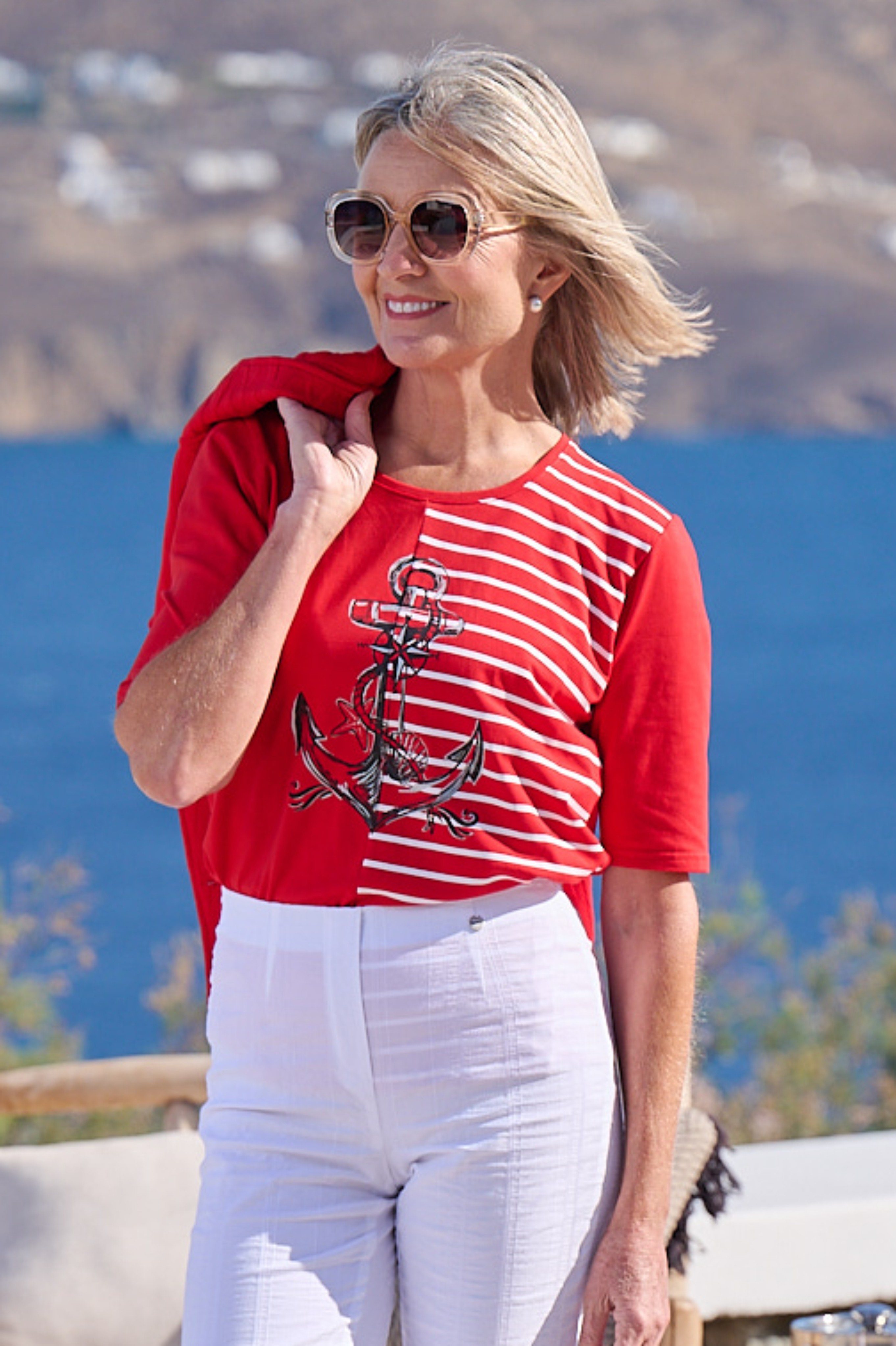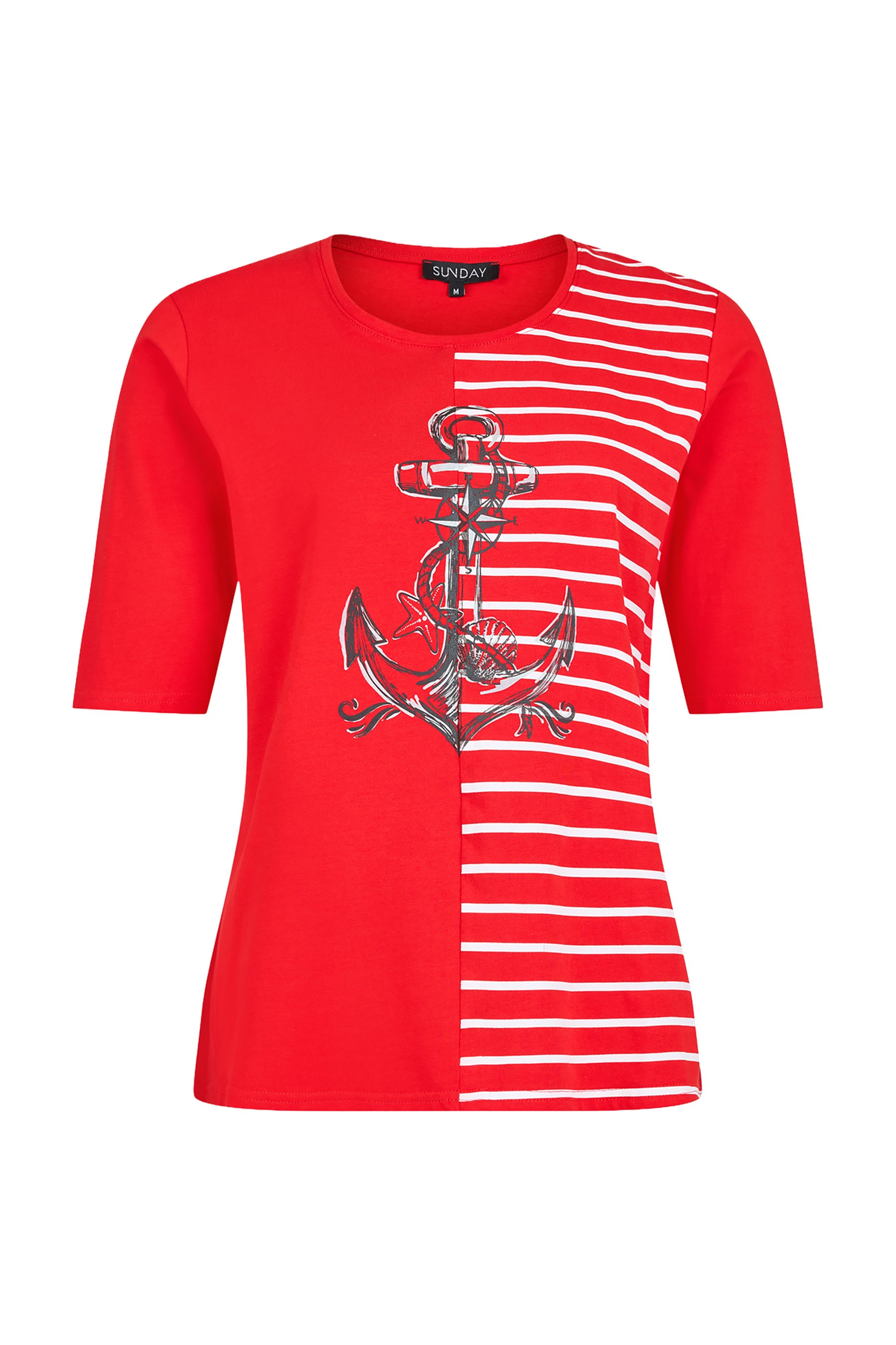 The bold red base is elevated by a contemporary split design: one side clean and minimal, the other accented with crisp white nautical stripes. A detailed anchor motif at the front adds a timeless maritime touch, creating visual interest without overwhelming the silhouette.