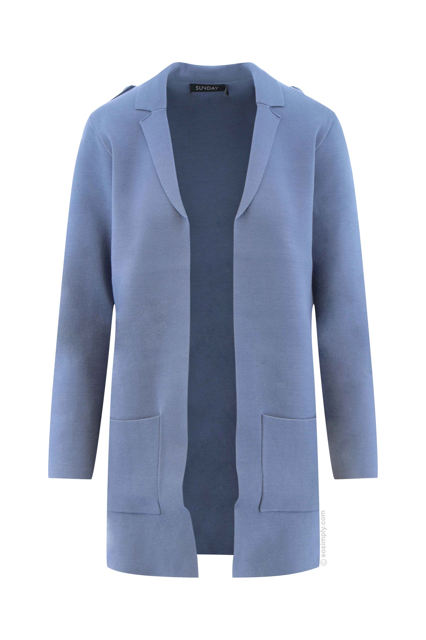 It has a simple edge to edge design without fastenings, a draped neckline and full length sleeves with tab detail on the shoulders